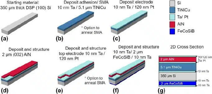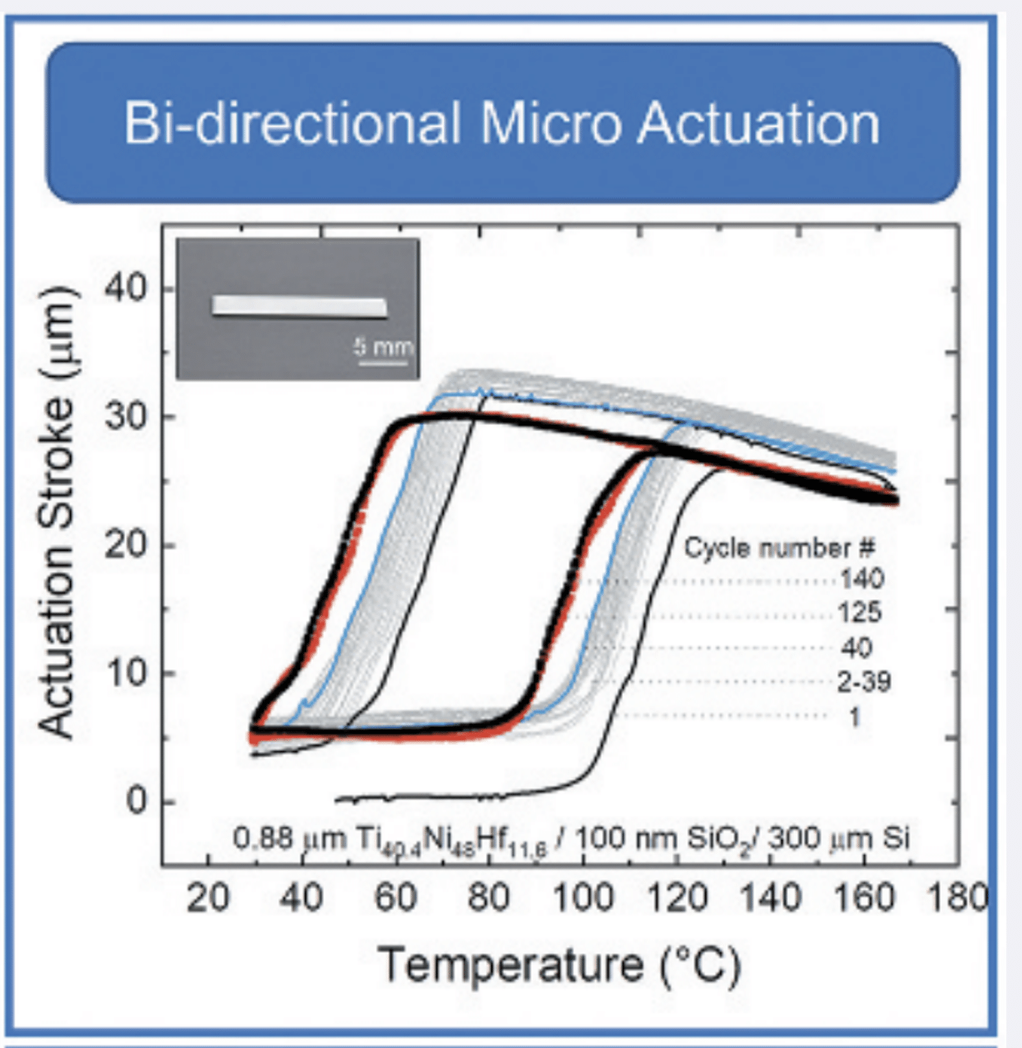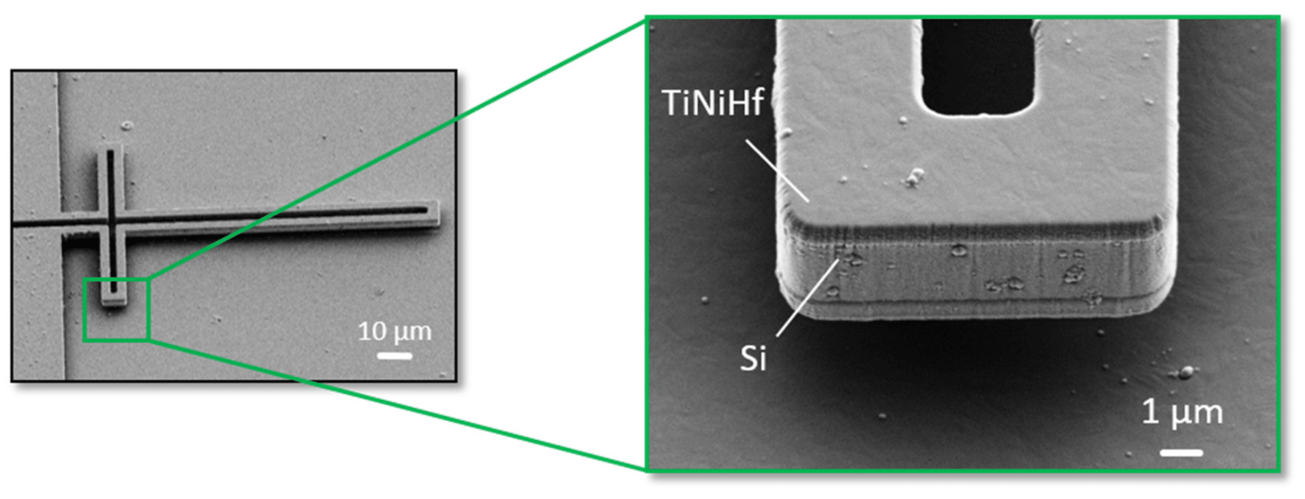 alloys is leveraged for bi-directional actuation with TiNiHf/SiO₂/Si composites. The shape memory properties of magnetron sputtered