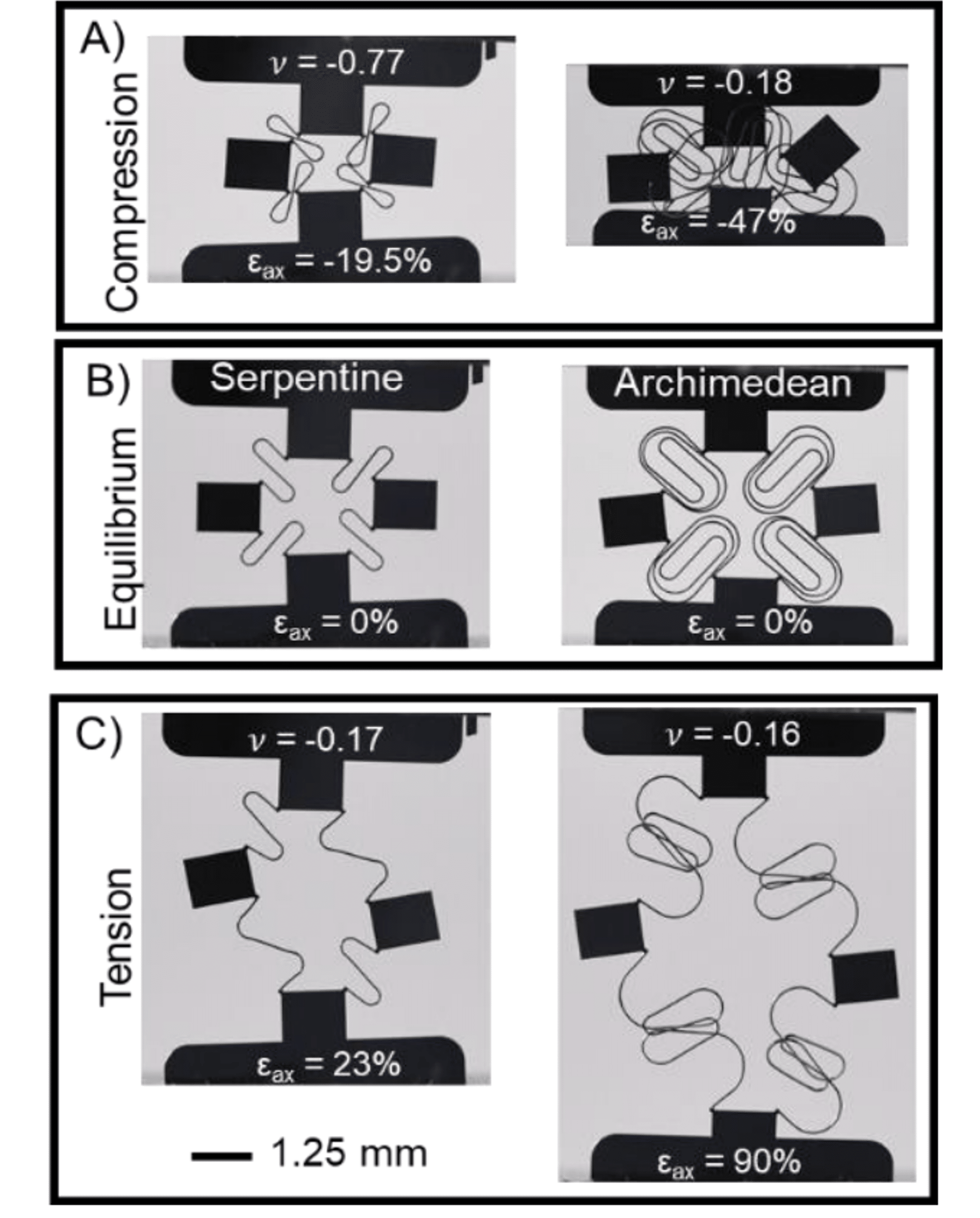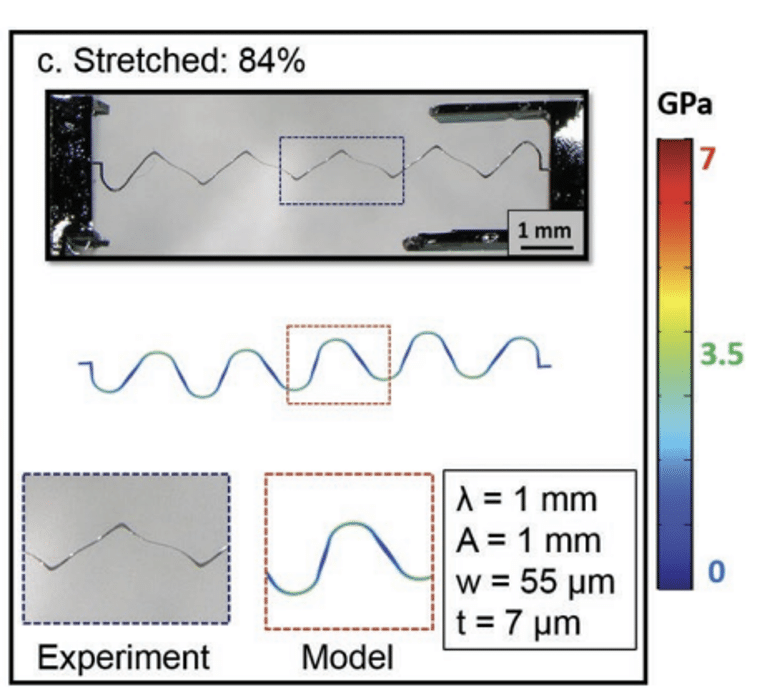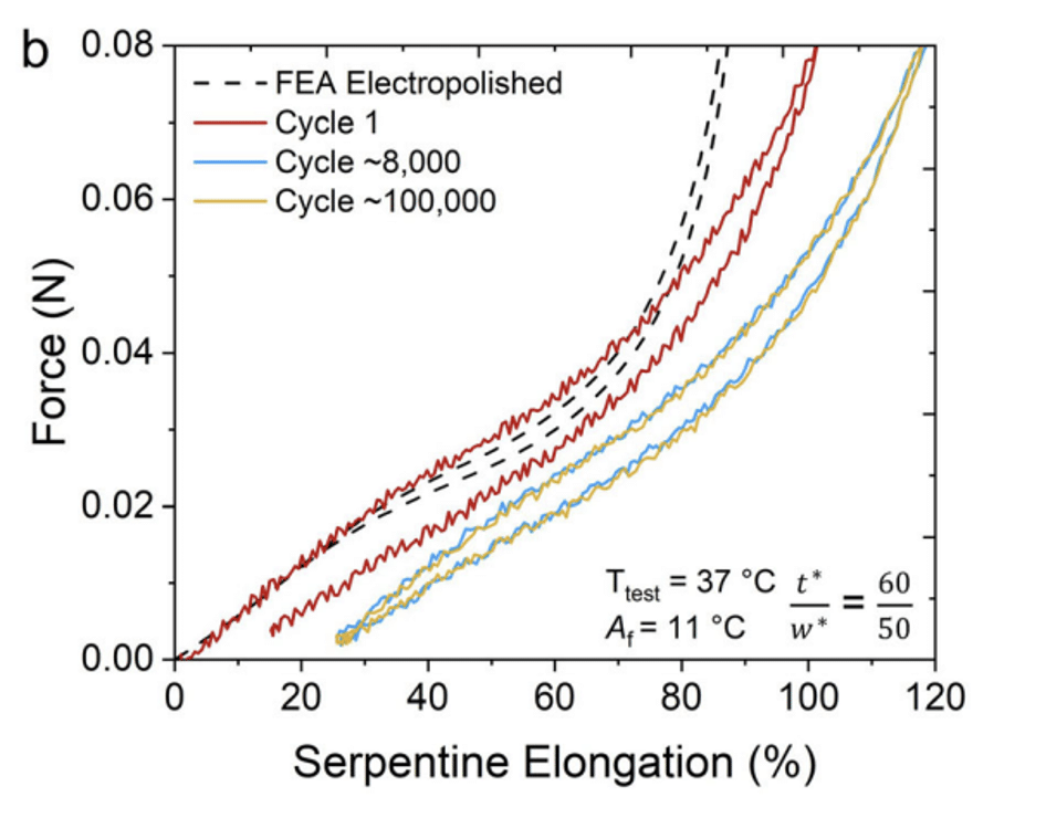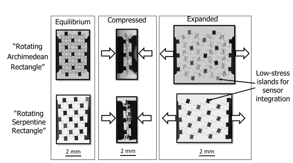 enhances conductivity. Additionally, the auxetic structure and superelastic properties of these films are leveraged to achieve polymer-compliant low stiffness, large deformation, and necking prevention.
